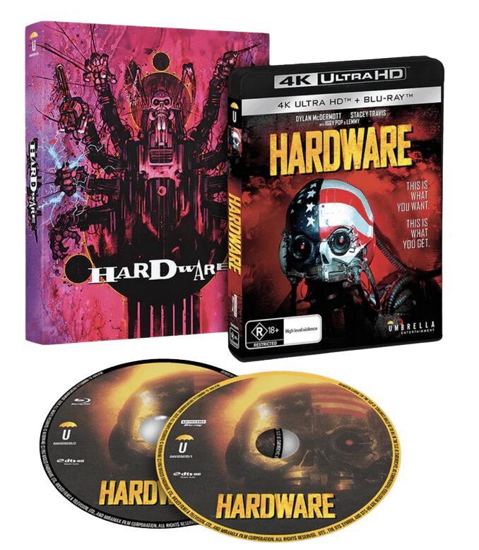 Umbrella Entertainment presents Hardware fully uncut and uncensored in 4K HDR. Remastered by Umbrella, this release has been supervised by director Richard Stanley (Dust Devil, Color Out of Space). HARDWARE is a fever dream of gore, sex, sweat, grease and sand delivered as a warning from a nihilistic future.